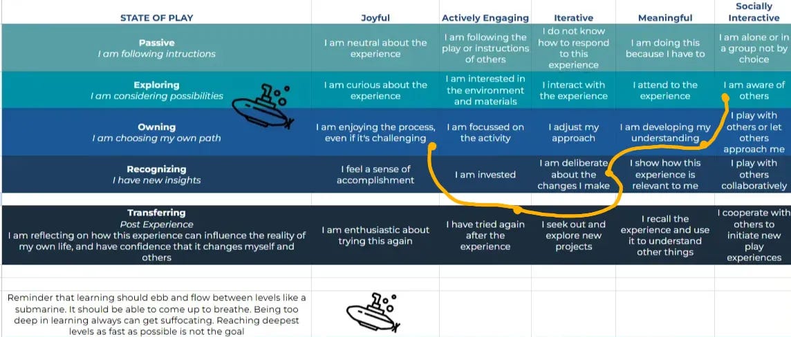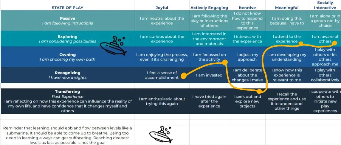 My favourite part of this is the submarine metaphor. The goal isn’t for kids to reach the deepest level as fast as possible. Developing and practicing skills takes time. Like a submarine on a deep sea mission: sometimes you need to come up for air!