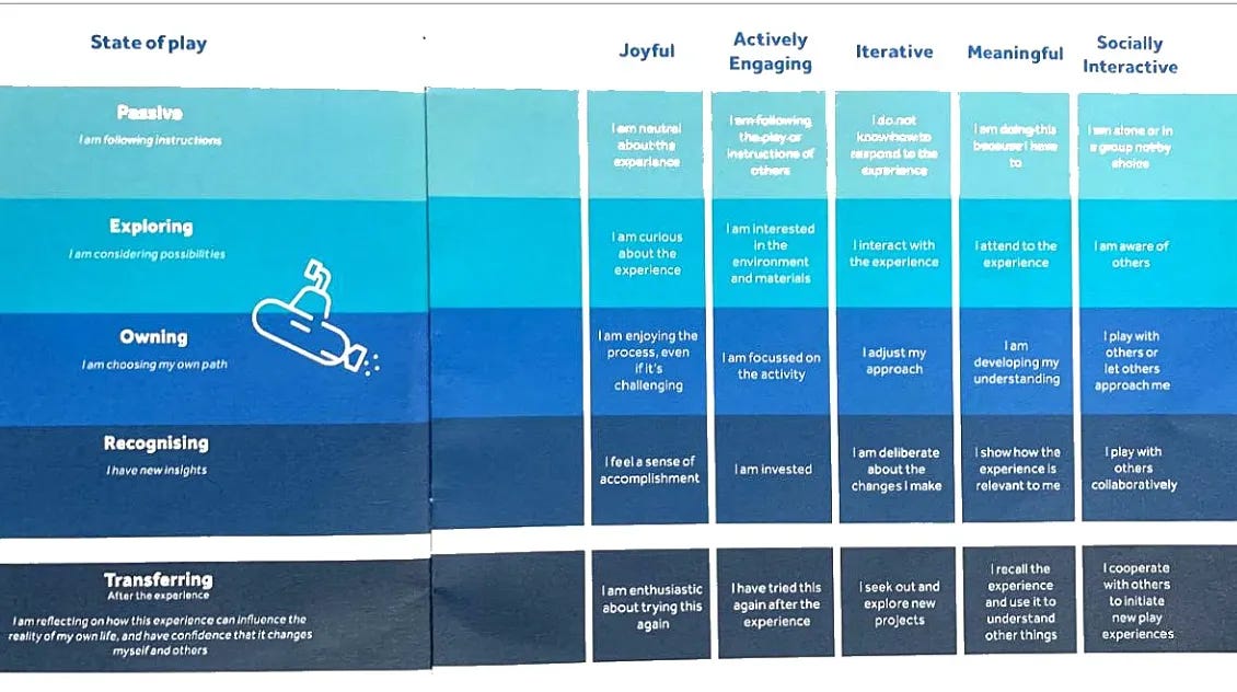 Okay yes, so far it might sound like it’s just listing a bunch of relevant characteristics that make learning playful. But just wait for the Experience Tool! With it, they’ve created descriptions of what the five experiences might look and feel like from the child’s perspective! You can make a behavioural coding using this.