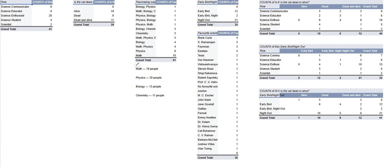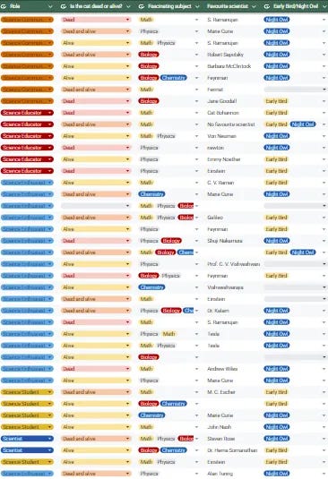 Marie Curie, S. Ramanujan, Feynman, Einstein, Tesla, Von Neumann, Vishweshvaraya, Steven Rose, Shuji Nakamura, Robert Sapolsky, Prof. C. V. Vishveshwara, <No favourite scientist>, Newton, M. C. Escher, John Nash, Jane Goodall, Galileo, Fermat, Emmy Noether, Dr. Kalam, Dr. Hema Somanathan, Cat Bohannon, C. V. Raman, Barbara McClintock, Andrew Wiles, Alan Turing