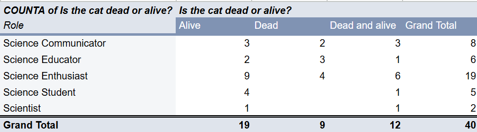Educators leaned towards killing the cat, maybe because curiosity is what kills them anyway! Science Communicators were the most evenly split , and had the highest percentage of “dead and alive”, probably cause Schrodinger’s cat makes for fun Science Communication! And Students were surprisingly optimistic.