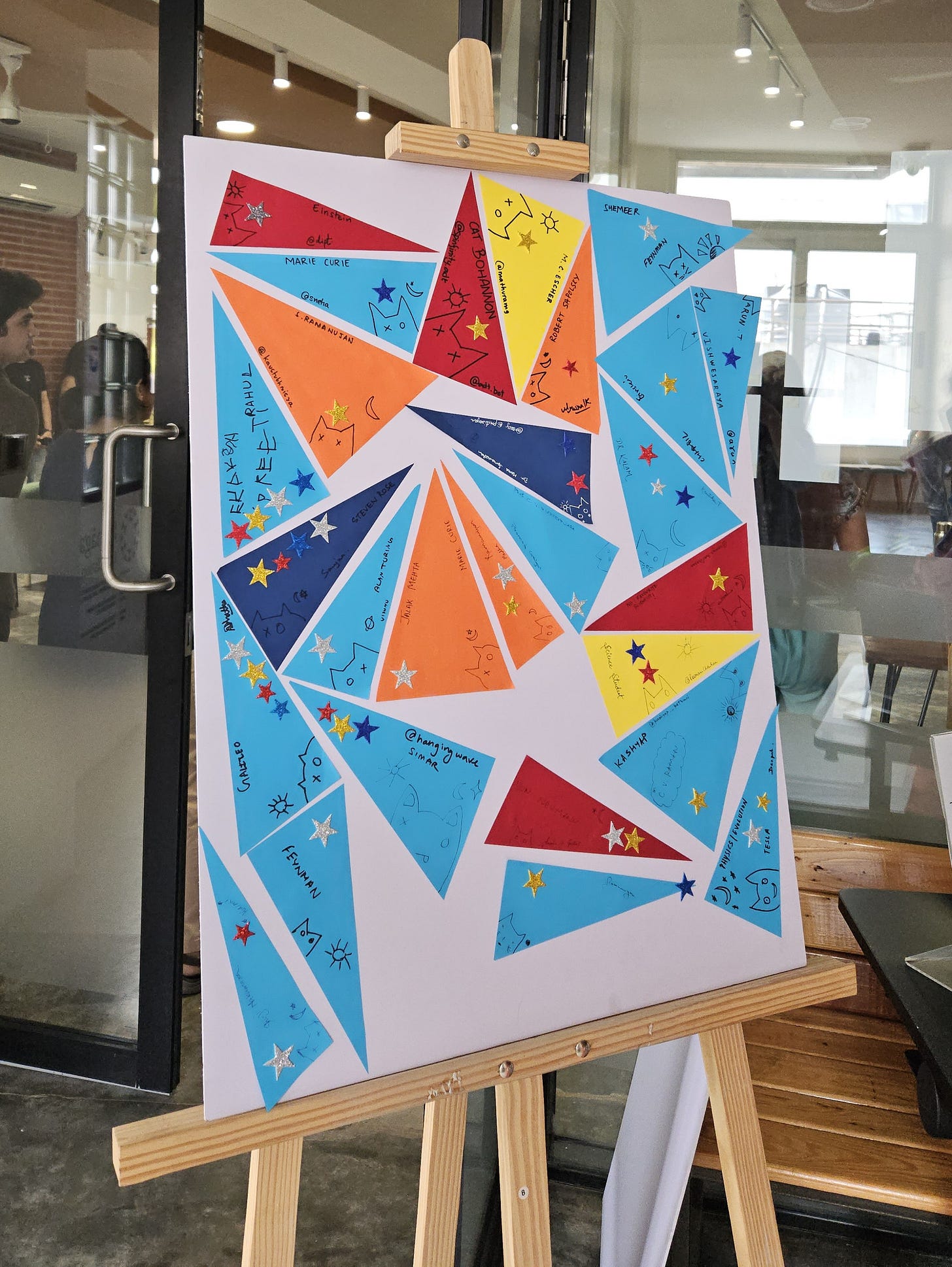On the day, I was juggling the event itself, but because of my attachment to this project, I kept popping in to see how the activity was going. Folks seemed to enjoy it. I heard things like, “This is such a nice way to see who’s in the room,” and “I had fun doing this.” People were especially pleased with themselves for marking Schrödinger’s cat with an X and an O. Folks asked each other, “Which one’s yours?” and showed their each other their triangles. One person mentioned that it would’ve been nice if it would be used and incorporated into a session, great point for next time! Maybe like the Human Spectrum ice-breaker.